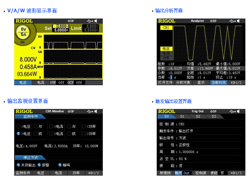 DP800系列屬于高性能的可編程直流電源。它們擁有強大的定時輸出功能,低紋波和噪聲,全面的過壓、過流、過溫保護功能,快速瞬態響應,擁有寬大、清晰的用戶界面,優異的性能指標,多種標準配置接口,可滿足臺式及集成的多種測試需求。