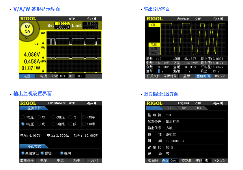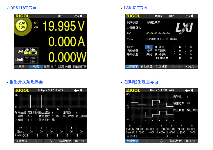 DP800系列屬于高性能的可編程直流電源。它們擁有強大的定時輸出功能,低紋波和噪聲,全面的過壓、過流、過溫保護功能,快速瞬態響應,擁有寬大、清晰的用戶界面,優異的性能指標,多種標準配置接口,可滿足臺式及集成的多種測試需求。