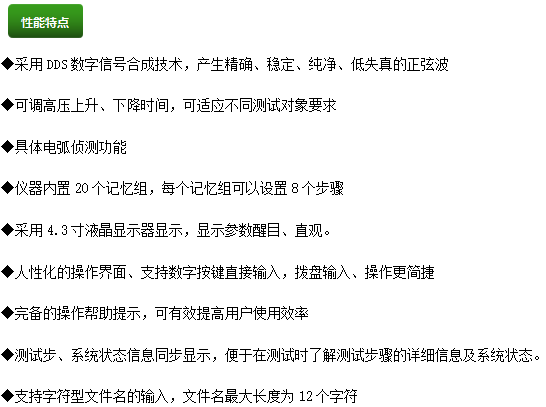耐壓測試儀,輸出電壓0.10~5.00kV(AC)/0.100~5.00kV(DC),漏電流范圍0.100~20.00mA(AC)/0.100~10.00mA(DC),測量精度±(2%+2個字)。