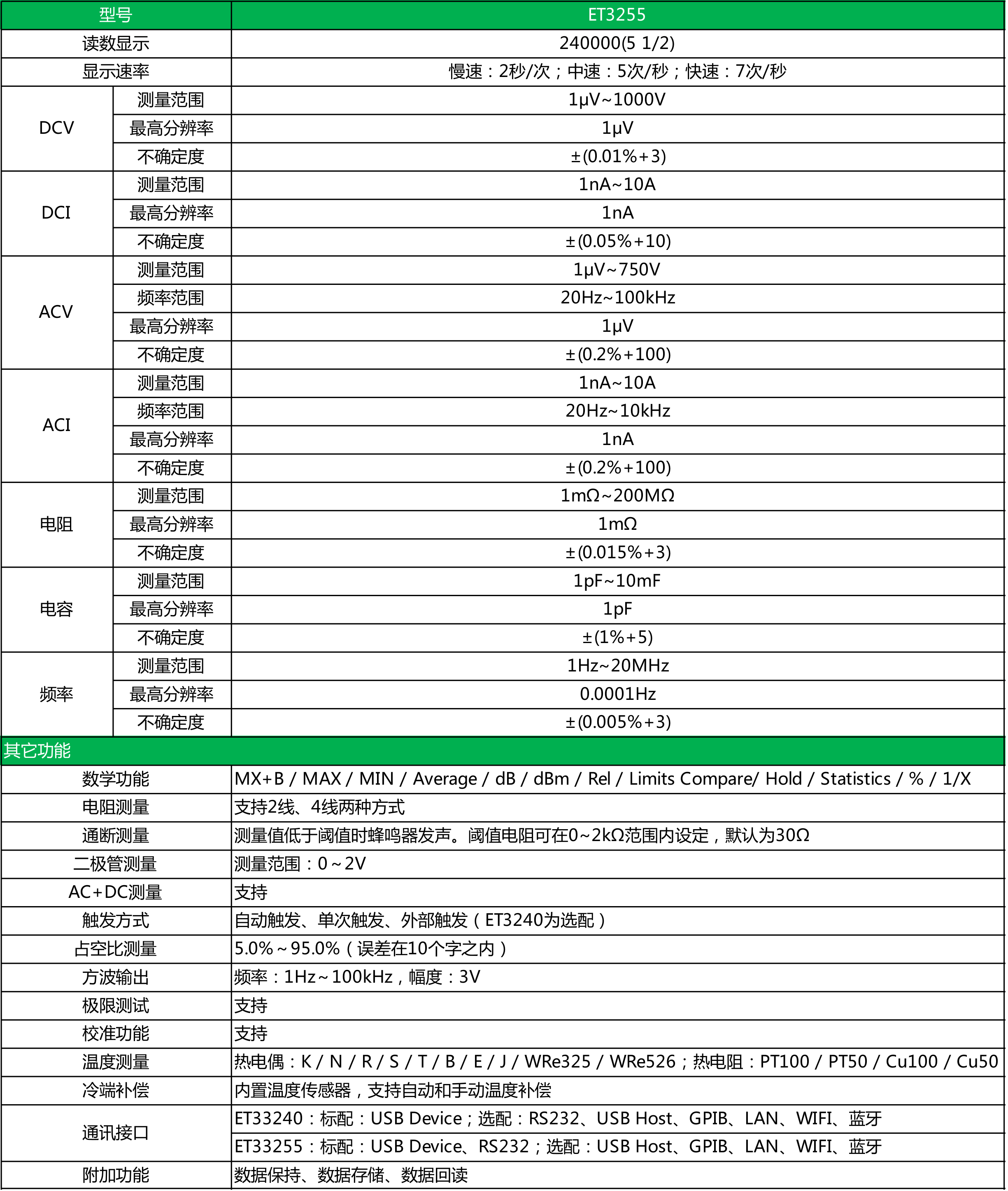 ET3255為功能全面、性能穩定的真有效值數字萬用表,本系列臺式萬用表提供強大功能,出色的性能,良好的用戶體驗;3.5寸TFT液晶屏顯示、讀數清晰、內容豐富,具有良好的顯示效果。本表采用市供電驅動使之成為高可靠性數字臺表。全功能、全量程過載保護和獨特的外觀設計使之成為電工以及高校實驗室的首要之選。