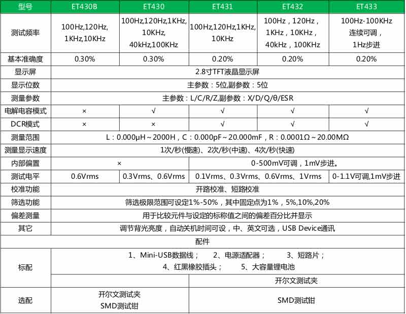 手持LCR數字電橋,頻率100Hz、120Hz、1kHz、10kHz、40kHz、100kHz,基本準確度0.2%,電平0.1Vrms、0.3Vrms、0.6Vrms,內部偏置0~500mV(1mV步進),偏差測量,2.8"TFT液晶顯示屏,USB接口。